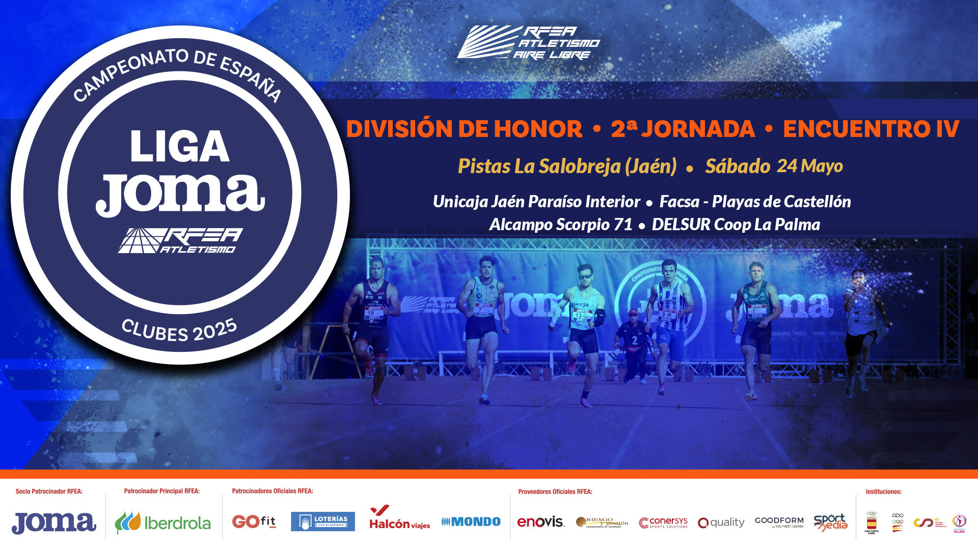 RFEA Cto España Clubes DH Hombres Liga Joma J2 (IV) - JAEN-PLAY-SCORP-DELSR 24 de Mayo Jaén Resultados en Directo Acreditación de medios INFORMACIÓN DE LA COMPETICIÓN NORMAS REGULADORASENCUENTROS, EQUIPOS ORGANIZADORES, SEDES, DORSALES, SORTEO - Circular 95/2025 Pruebas de la competición UBICACIÓN INSCRITOS RESULTADOS Resultados de la competición
