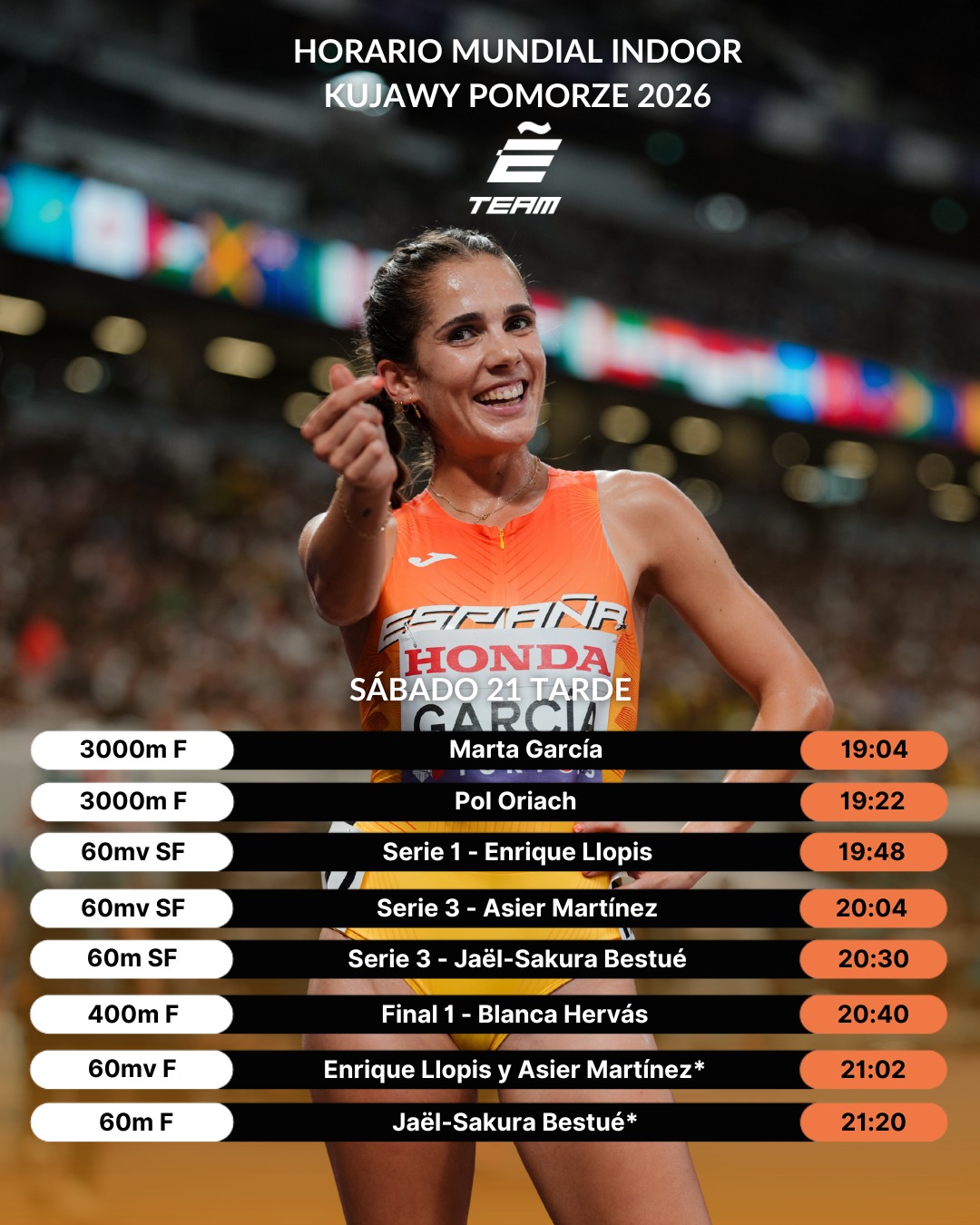 La jornada continuará en el Kujawsko-Pomorska Arena de Toruń con una intensa sesión vespertina para #EspañaAtletismo: Marta García disputará la final de 3000 m, seguida por Pol Oriach en la misma distancia; Llopis y Martínez buscarán la final en 60 m vallas; Bestué intentará meterse en la final de 60 m; y Blanca Hervás volverá a escena en los 400 m en busca de las medallas.