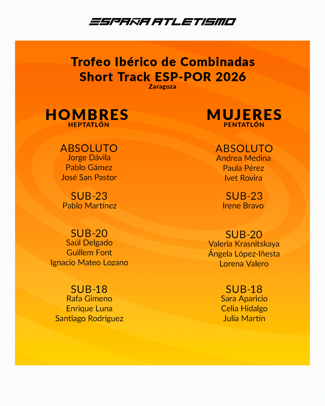 En heptatlón y pentatlón Sub20 estarán los podios completos de su categoría en el nacional short track: Valeria Krasnitskaya (3790 p MP), campeona e internacional en el Trofeo Ibérico de 2025 donde fue bronce, Lorena Valero (3691 p MP), subcampeona en Sabadell y Ángela López-Iñesta (3646 p MP), bronce en el Campeonato de España Sub20 y que también repite en esta competición. Saúl Delgado (5146 p MP), campeón este fin de semana en Sabadell, Ignacio Mateo Lozano (5094 p MP), subcampeón y Guillem Font (5091 p MP), que completó el podio.