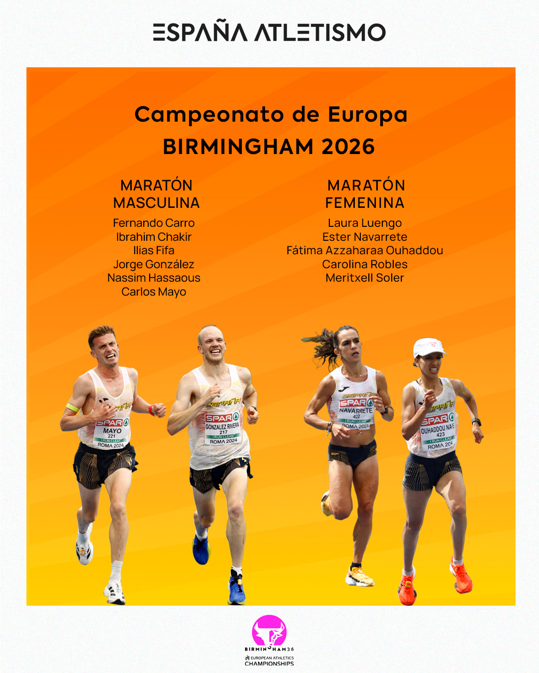#EspañaAtletismo comienza a carburar de cara al Campeonato de Europa de Birmingham que se celebrará del 10 al 16 de agosto por primera vez en tierras británicas. Y lo hace presentando al equipo que competirá en la prueba de maratón, que, además de poner en juego medallas individuales, también será válida para la competición por equipos.