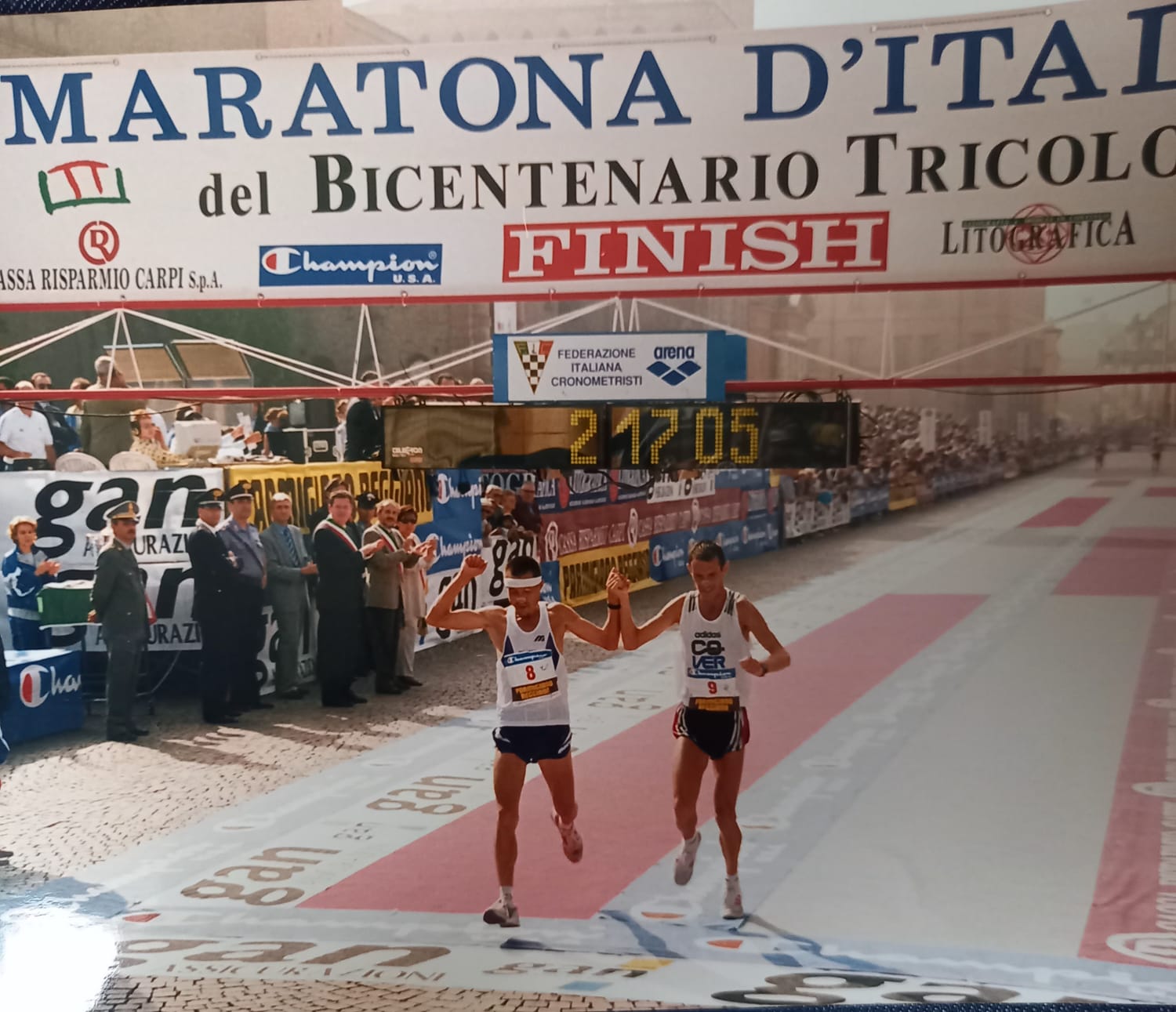 Maratón de Carpi 1997; llegando a meta junto a su amigo y compañero José María González