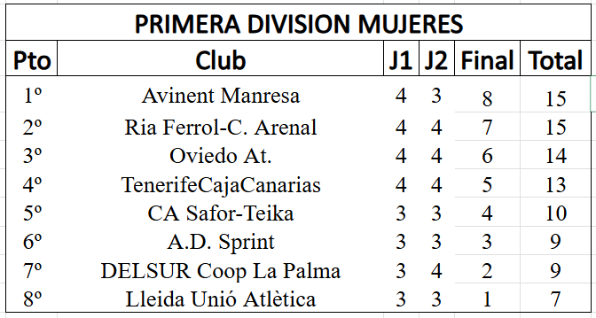 RFEA Cto España Clubes 1D Mujeres Liga Iberdrola - Final Título 15 de Junio Soria Resultados en Directo Acreditación de medios INFORMACIÓN DE LA COMPETICIÓN NORMAS REGULADORASENCUENTROS, CLUBES ORGANIZADORES, SEDES Y SORTEOS - Circular 112/2025CLASIFICACIÓN TRAS LA 2ª JORNADACLASIFICACIÓN FINAL - DIVISIÓN DE HONOR Y PRIMERA DIVISIÓN Pruebas de la competición DOCUMENTACIÓN UBICACIÓN INSCRITOS RESULTADOS Resultados de la competición
