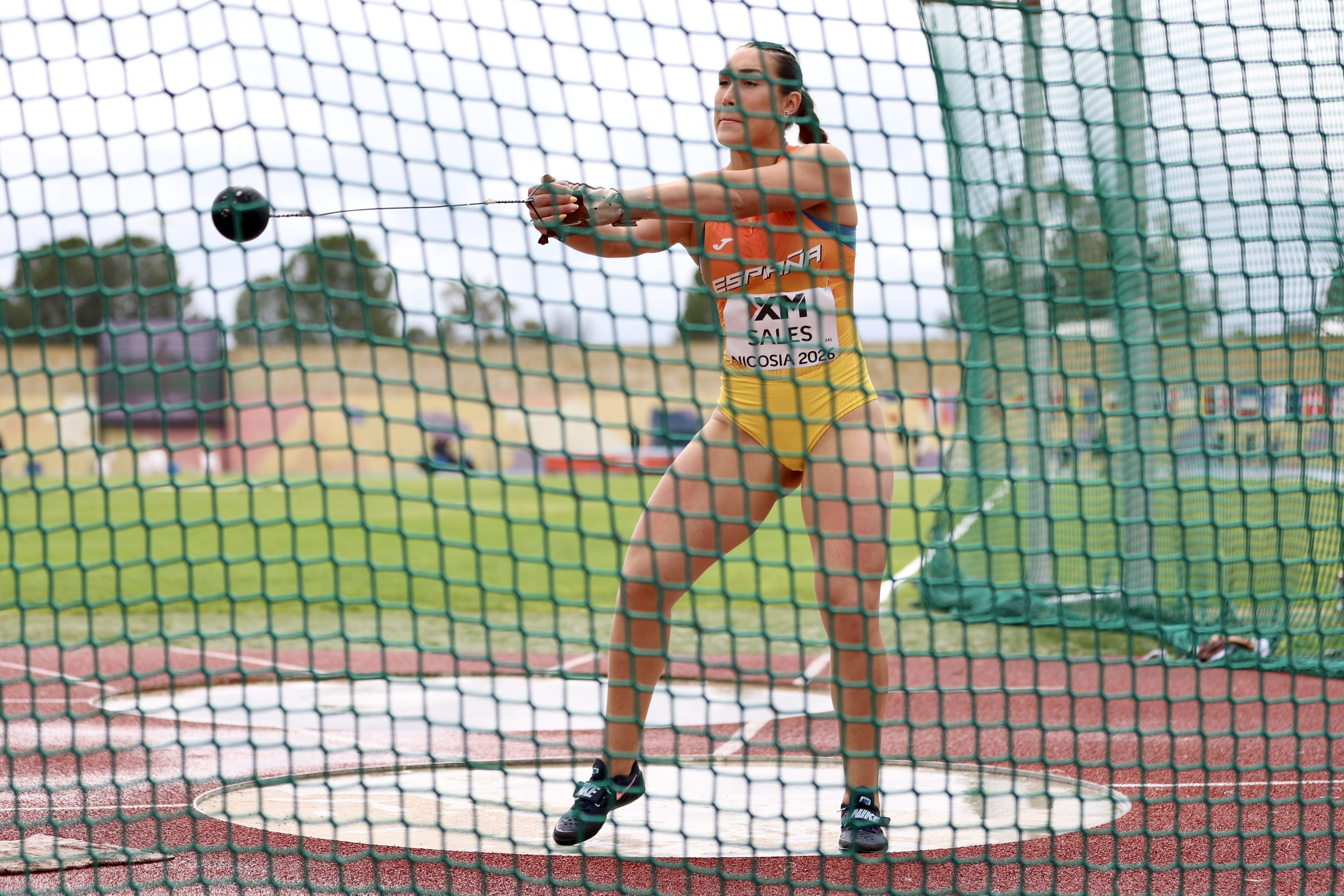 La jornada final de la mañana no pudo comenzar mejor gracias a una Andrea Sales en estado de gracia. La castellonense, entrenada por Toni Simarro —presente también en esta Copa de Europa— firmó la mejor competición de su vida frente a rivales de enorme nivel. En su cuarto intento lanzó el martillo de 4 kg hasta 68.91 m, nuevo récord de España que mejora en cuatro centímetros la histórica plusmarca de Berta Castells lograda en 2004.