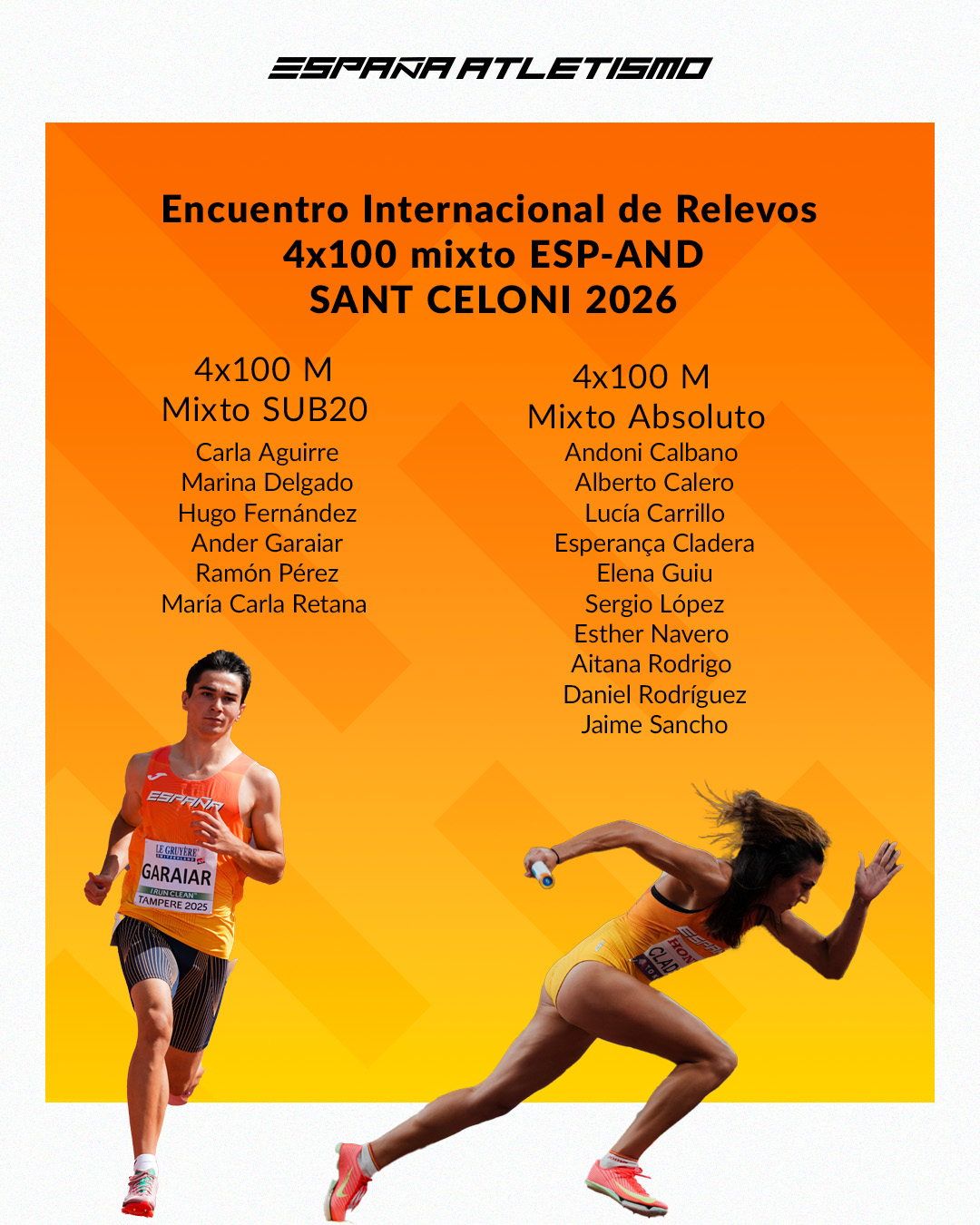 El bloque absoluto lo completan Jaime Sancho (medalla de bronce en el Europeo sub23 de 2025 en 200 m), Elena Guiu (octava en el Mundial sub20 en 2022 y quinta el pasado año con el relevo 4x100 m en el Europeo sub23) y Lucía Carrillo (campeona de España de 100 m en 2023).