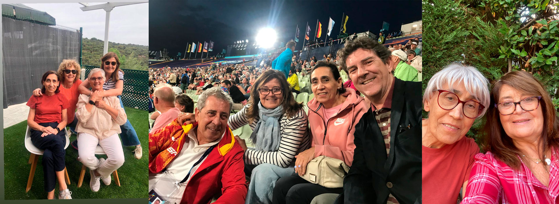 A la izquierda y sentada junto a Olga Dalmau y por detrás, Asunción Morté e Isabel Mozún; en el centro, en el Europeo de Múnich 2022 junto a Ramón Cid e Isabel Mozún y a la derecha, una foto muy reciente con Lucía junto a Mozún.