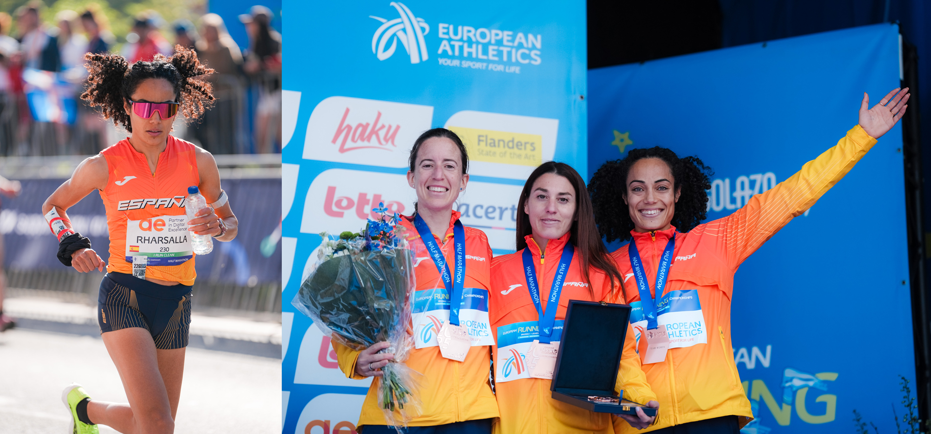 Quizá por eso su debut en maratón, en Sevilla, fue una mezcla de ilusión y aprendizaje, “intenté correrlo como una carrera de trail running… iba por sensaciones y vino el tío del mazo”. Aun así, la progresión fue tan sorprendente que terminó clasificándose para el primer Europeo de Ruta en Bruselas, donde participó en el medio maratón. Aquella carrera la marcó más de lo que reflejan las listas de resultados, “me puse mala justo antes del viaje, iba con mascarilla y los medicamentos me pasaron una mala jugada estomacalmente… no podía sostener un ritmo continuo”, cuenta. A mitad de carrera, la urgencia de encontrar un baño la obligó a contemplar la idea de parar, “estaba en mitad de Bruselas mirando a todos lados pensando: Dios mío, dónde me meto”. Hasta que escuchó a los responsables técnicos: “¡Vais terceras!”. Y siguió adelante, “menos mal que no me rendí… ni de lejos imaginaba que íbamos a conseguir algo así”.