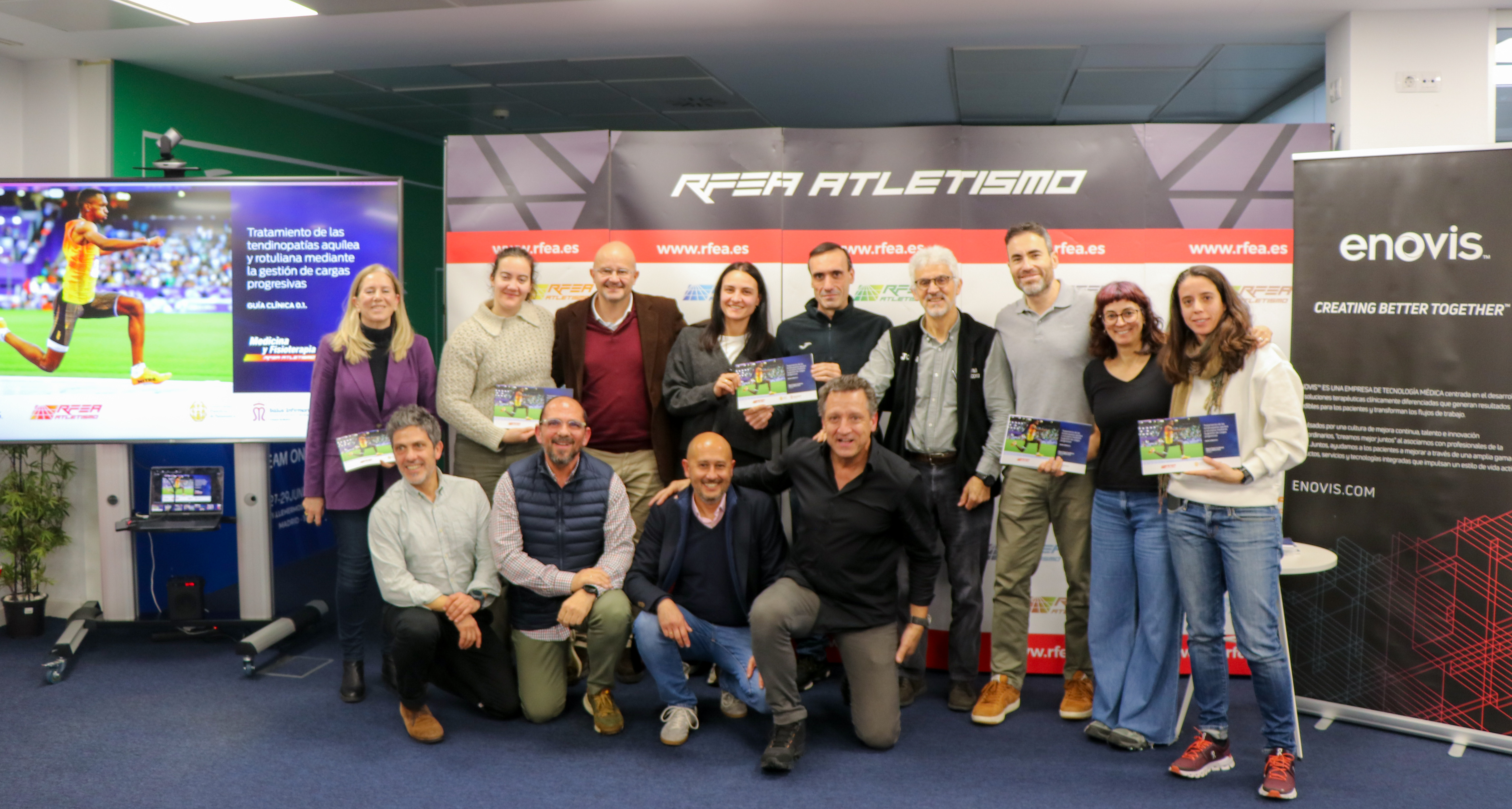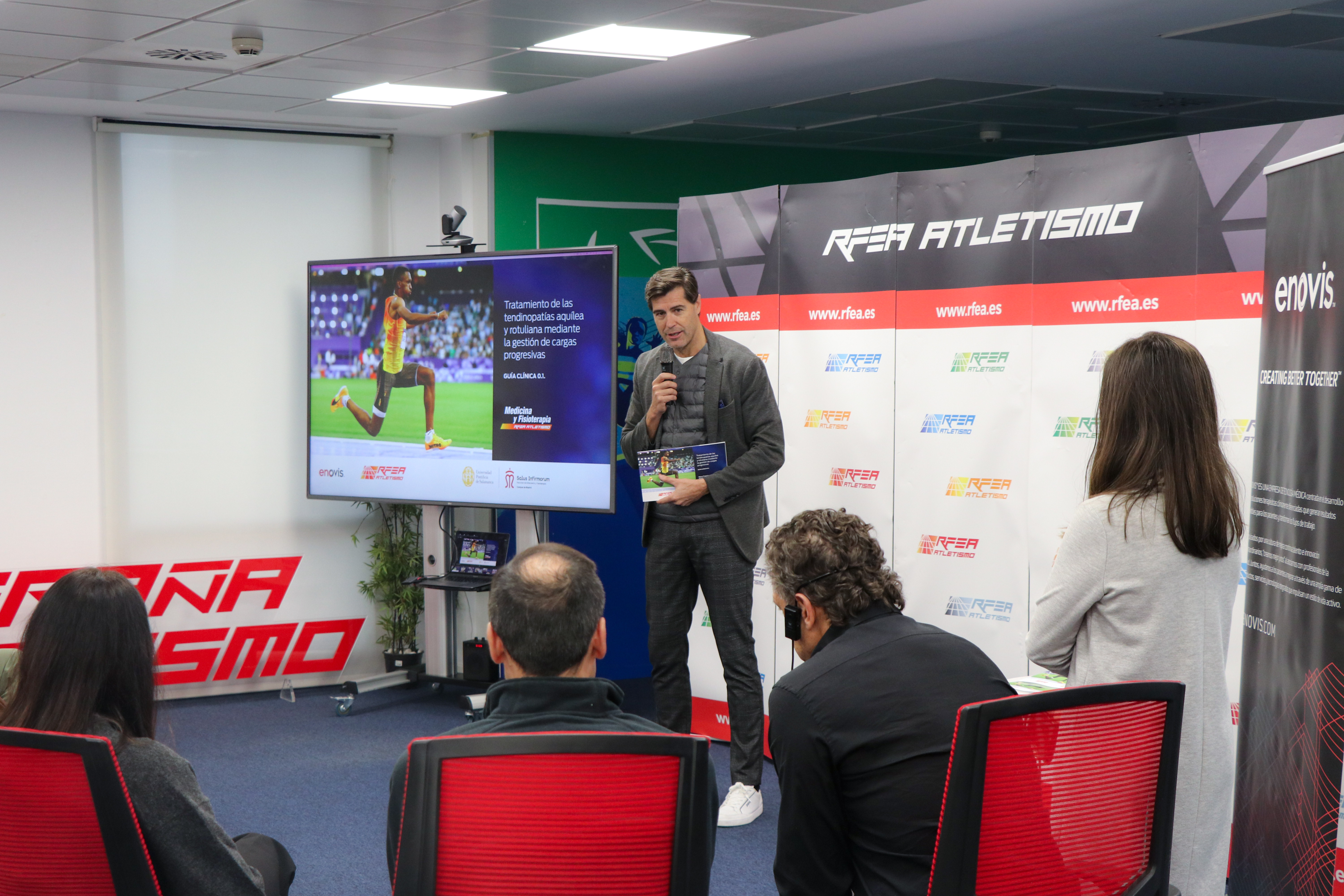 La Real Federación Española de Atletismo (RFEA) ha presentado esta mañana sus nuevas Guías Clínicas, un proyecto estratégico que nace con la vocación de compartir el conocimiento generado durante décadas en la alta competición y ponerlo al servicio del conjunto del atletismo y de los profesionales de la salud. La primera de estas publicaciones, titulada Tratamiento de las tendinopatías aquílea y rotuliana mediante la gestión de cargas progresivas, ha sido coordinada por Miquel Cos, responsable de Fisioterapia de la RFEA, junto a Alberto Melián, vicedecano del Grado en Fisioterapia de la Universidad Pontificia de Salamanca, y supone un paso decisivo en la consolidación de la Federación como referente en la generación de conocimiento aplicado al deporte.