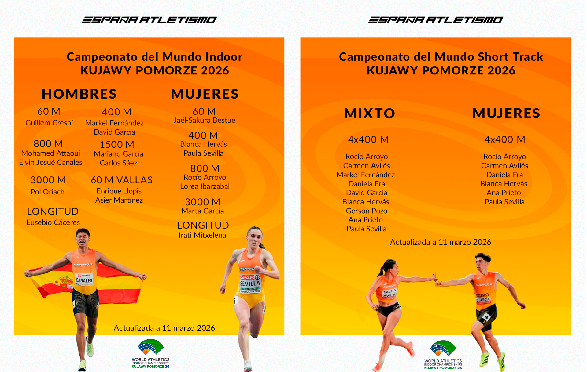 Finalmente, un total de 22 atletas (10 mujeres y 12 hombres) han sido preseleccionados para representar a #EspañaAtletismo en el Campeonato del Mundo Indoor de Kujawy Pomorze 2026, tras cumplir los requisitos establecidos por World Athletics y los criterios de preselección fijados por el Área de Alto Rendimiento, y la Dirección Deportiva de la RFEA.