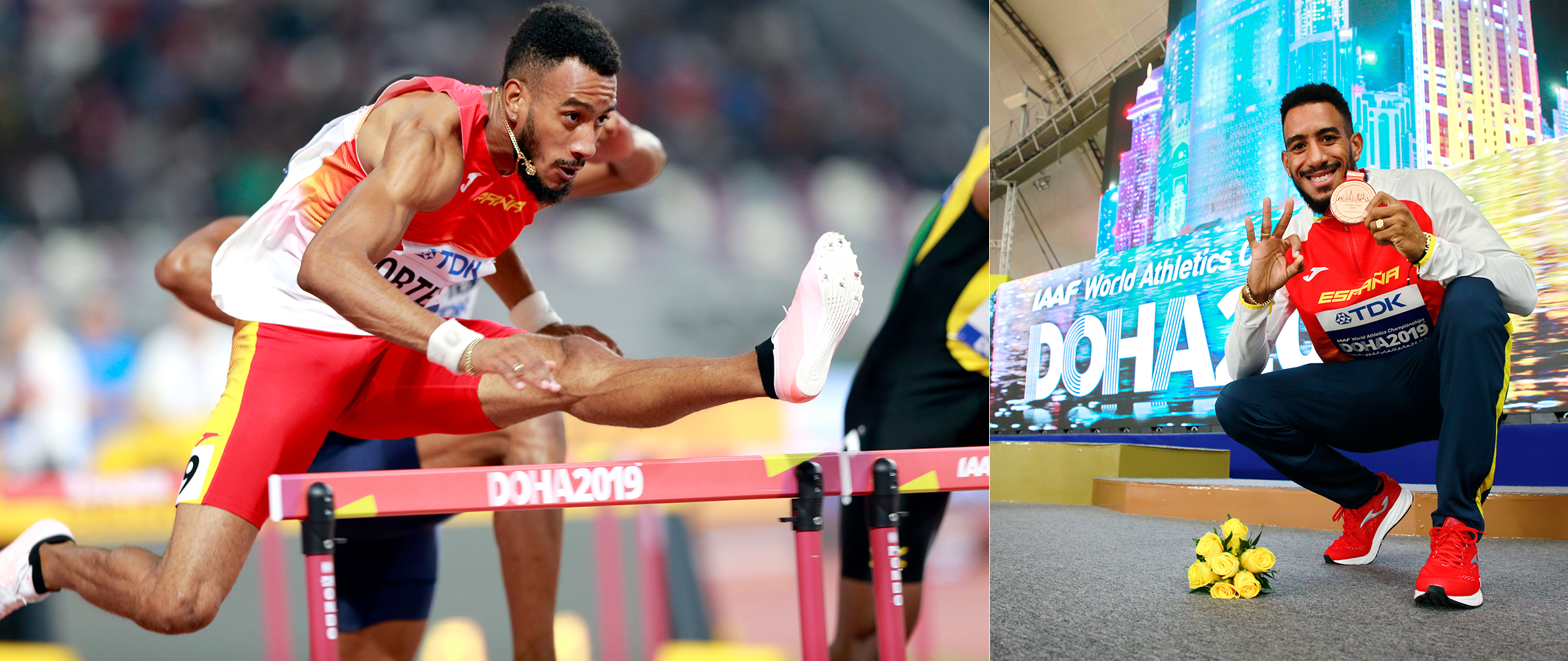 Al año siguiente, Orlando vivió toda una montaña rusa de emociones con su accidentado bronce en el Mundial de Doha 2019, donde aspiraba a todo. Con sus 13.05 de Lausana, sólo los estadounidenses Grant Holloway y Daniel Roberts le precedían en el ranking del año… y Roberts fue descalificado en primera ronda. En esa criba inicial, el vallista español firmó el mejor tiempo: 13.15. Y en ‘semis’ también ganó su carrera con 13.16, aunque McLeod, Holloway y Martinot-Lagarde fueron más rápidos. Ya en la final, sólo Holloway y McLeod le precedían claramente a mitad de carrera, y Ortega se disponía a asestar su clásico ‘hachazo’ final. Sin embargo, el jamaicano se desequilibró patosamente hacia su derecha en la penúltima valla y, antes de acabar por los suelos, obstruyó y frenó claramente la fulgurante progresión del español. Así, lo que parecía apuntar hacia una plata para Orlando (incluso él mismo creía que podría haber acabado ganando a Holloway por ‘foto finish’) se quedaba en un insípido 5º puesto en meta (13.30), mientras Holloway (13.10), Shubenkov (13.15) y Martinot-Lagarde (13.18) copaban las medallas. Pero la RFEA luchó por que se hiciese justicia y, tras casi 24 horas de reclamaciones y abatida espera del atleta, a Orlando se le otorgó el tercer puesto que ocupaba cuando sufrió la obstrucción, y compartió bronce con el francés. Fue la primera y única medalla para España en la cita catarí, y un justo consuelo que el vallista agradeció infinitamente…