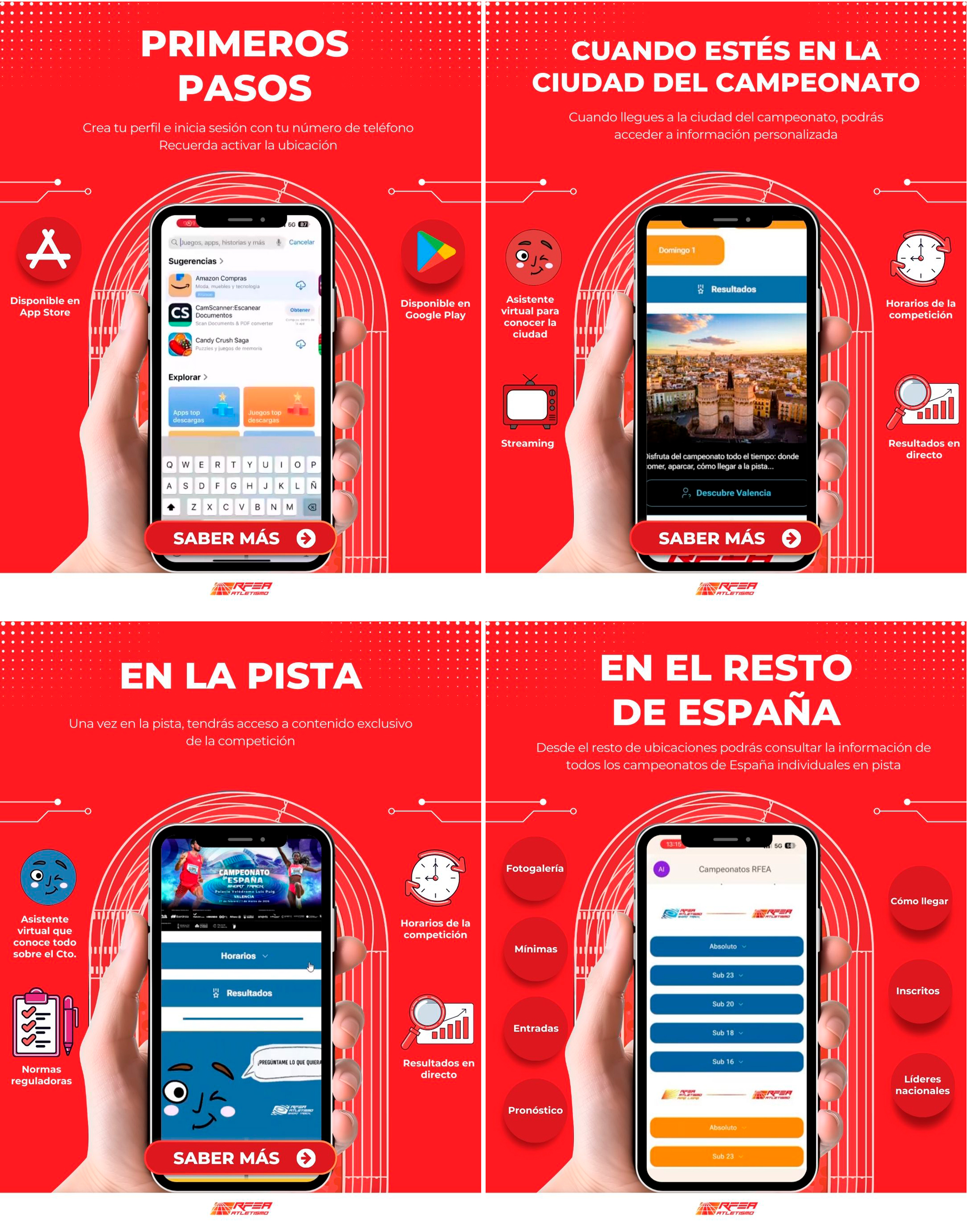 La aplicación reúne en un único entorno digital los siguientes Campeonatos de España individuales de pista: Short Track (absoluto, Sub23, Sub20, Sub18 y Sub16) y Aire Libre, donde además se incluye la categoría Sub14. Desde el primer acceso, el usuario podrá consultar de manera ágil y ordenada toda la información relevante de cada campeonato: mínimas de participación, horarios, listados de inscritos, resultados en directo, streaming y otros contenidos de interés.